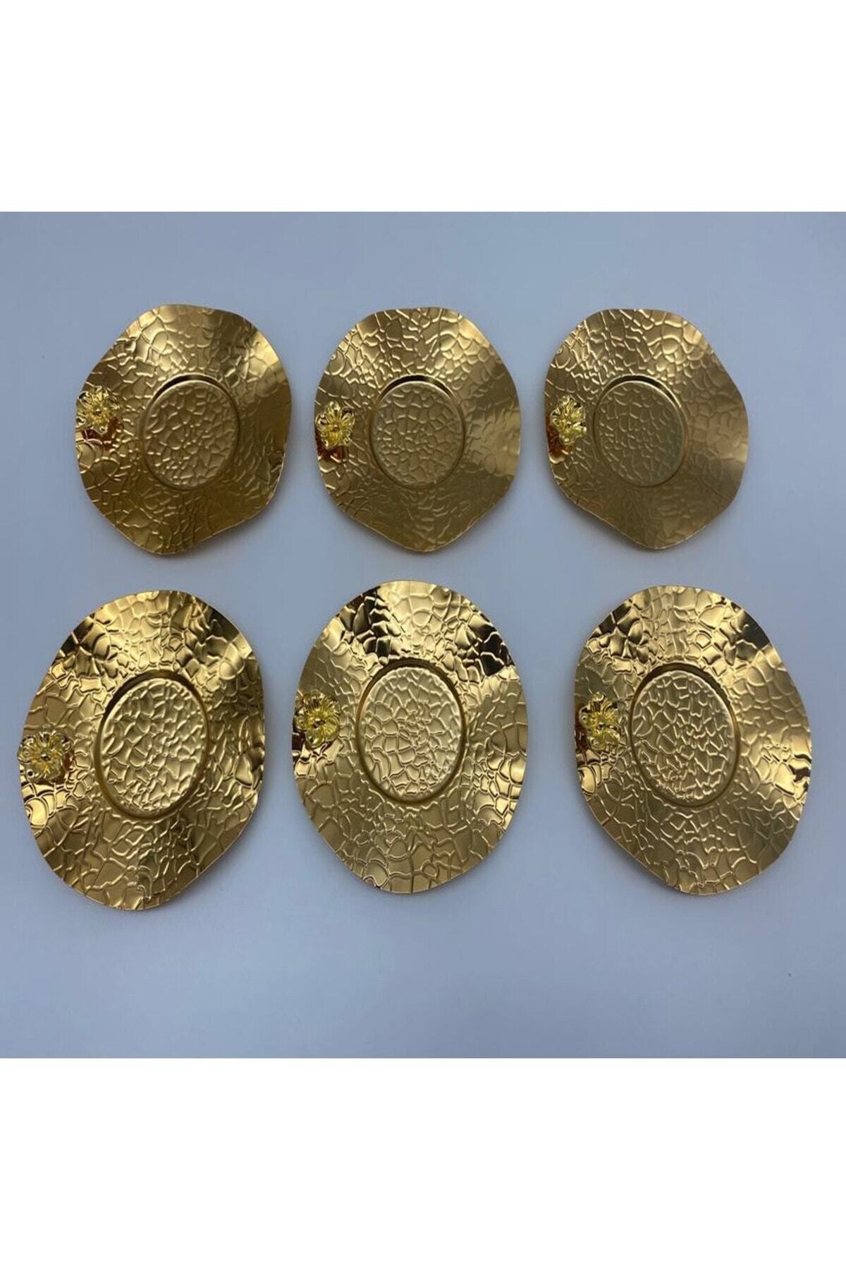 6-Piece Tea Plate For gold lovers, floral, wavy model, sparkling tea plate. It will add color to your tea and coffee presentations. Our tea plate is made of metal material and colored with a long-lasting lacquer coating that does not fade. It can be wiped with a slightly damp cloth, keep it away from chemicals to prevent color fading.